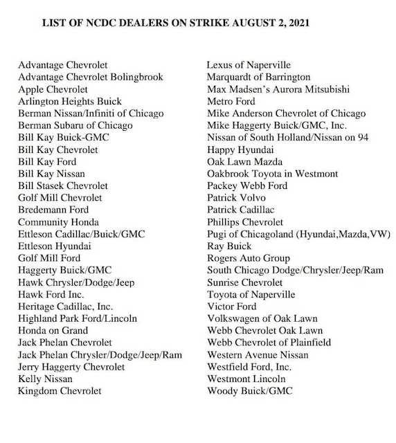Auto mechanics from Hawk Ford, Happy Hyundai, Oak Lawn Mazda, Volkswagen of Oak Lawn and Webb Chevrolet were seen alternately walking the picket line on Monday.