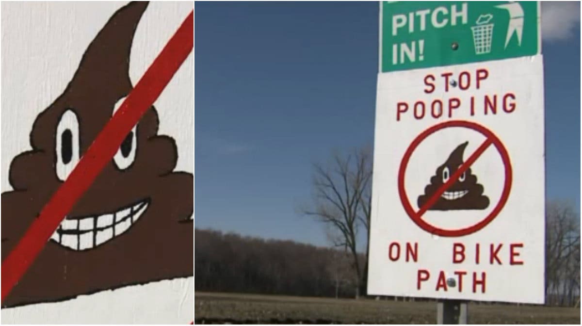 They aren’t accidents, either. Restrooms are nearby. The town is so sick of the purposely laid messes that a most unusual step has been taken. Two warning signs recently were planted that read: “Stop pooping on bike path.”