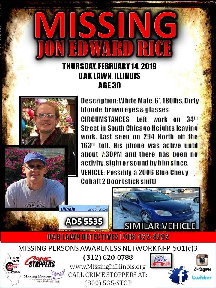 Anyone with information about Jon Rice or knows of his whereabouts is asked to call the Oak Lawn Police Department detective division at 708-422-8292, or 911. His family is very worried.