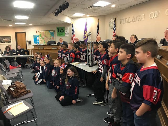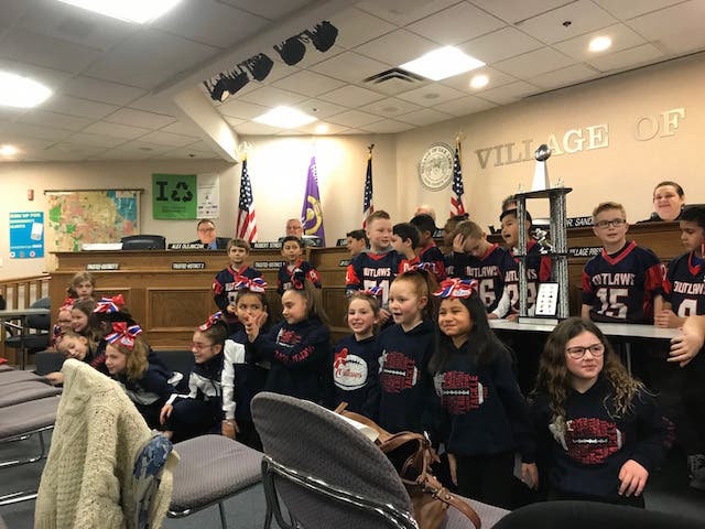 The Oak Lawn Outlaw Pee Wee Super Bowl champs and Cheer Team take well-deserved bow at village board meeting.