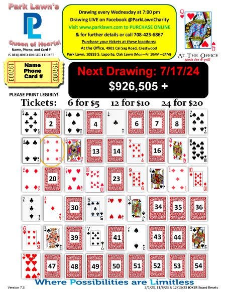 Park Lawn Queen of Hearts board for the July 17, 2024 drawing.