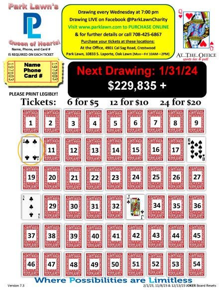 Online sales close at 2 p.m. the day of the drawing. In each online transaction, the purchaser will only be allowed to select a single number to represent the card in which they want to be revealed on the Queen of Hearts game board. That number, along with the buyer's name and phone number, will be written down by a Park Lawn representative on all the tickets purchased in that transaction and placed into that week's drawing. Read the terms and conditions. Players must be 18 or over.