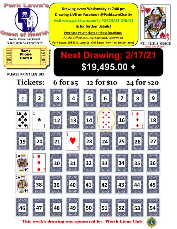 OAK LAWN, IL — Park Lawn’s progressive Queen of Hearts raffle jackpot is back and has swelled to over $19,495 and is still growing. The elusive lady has yet come out of hiding after another interruption by the pandemic. Last week's pick was the 10 of diamonds, the winner of which received 24 free tickets for the next drawing.