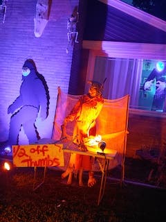 Bigfoot Burial Ground, 10946 Knox Ave., Oak Lawn – We LOVE Matt and Erin’s Bigfoot theme. They moved to Oak Lawn four years ago and keep adding a little every year. This is their first time on the scary yard tour. Newly added scares include an infinity grave keeper and a pig man butchers who cuts up human parts for sale. The other half of the yard comprises inflatables for the young folks. Check out the life-sized skeleton twins having fun in their teeter-totter. Matt and Erin plans on having a hot popcorn machine on Halloween along with candy. You may even catch a glimpse of their three dogs – two Great Danes and an English bulldog, who all love dressing up in costumes as well.