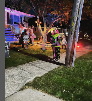 NEW! KRAZY KORNER, 94TH AND MOBILE, OAK LAWN — Krazy Korner has reached new heights in kraziness with the addition of a backyard walk-thru haunt that is pretty intense. Hard to believe that sweet little boy we took a photo of whispering into Santa’s ear ten years ago, is now a 14-year-old crazy clown chasing old ladies with a chainsaw. The corner lot filled with monsters, corn creatures and bugs that jump out at you. Rick and Care Herpich have added a 12-foot-tall phantom and skeleton that are all the rage this year. The yard is lit from dusk to 10 p.m. most nights through Halloween. The walk-thru is open Friday and Saturday evening. Awesome display. You can get out and walk around. Wait to you see what they do for Christmas. Member of Chicago Haunt Builders.