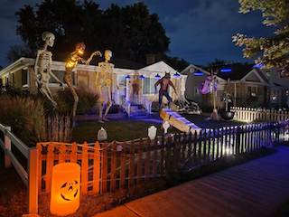NEW! Skullnbone Cemetery, 14519 Club Circle Drive, Oak Forest – Ginger Jackson’s boneyard is currently up and running. Features a trio of witches, more than a dozen ghosts, skeletons causing mischief and mayhem and spooky lighting. Many items are handmade, DIY and/or repurposed items. The display has expanded again this year with more items and details. Lights are on at 5 to 10 p.m. weekdays, 11 p.m. on weekends.
