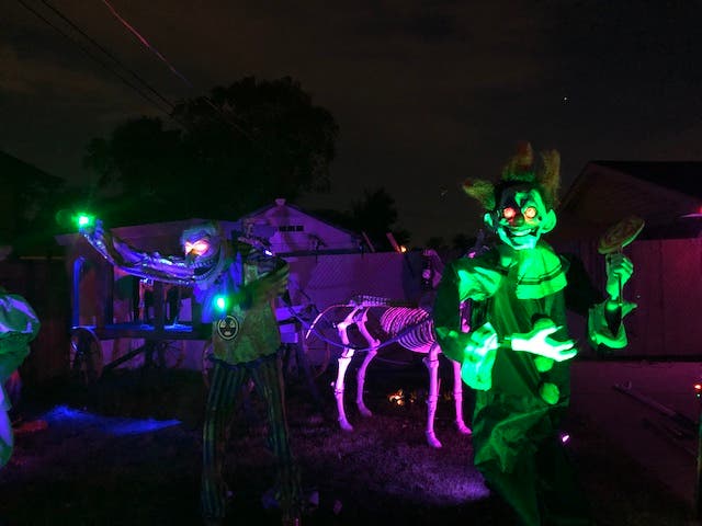 Alien Invasion, 718 Ridge Road, Lemont – Nicole Grajek has a War of the Worlds-esque alien invasion set up on her lawn, with a radio transmitter that broadcasts their breaking news broadcast at 90.5 FM, and a video broadcast that be scanned from her QR code. Colored fog, aliens and a creepy transparent ghost that passes by the front window.