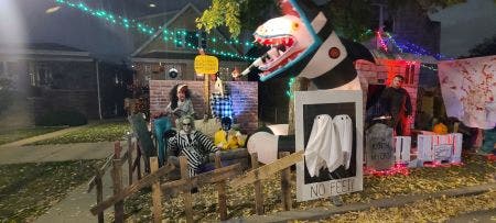 “Chills On Chestnut,” 7653 Chestnut Drive, Orland Park – Jennifer Storino is passing on her love for Halloween to her kids. They’ve gone all out with skeletons in their yard set against a haunted hotel scene set up in the garage. Jennifer confesses that they decorate the entire inside of their house, each room having a different theme: the basement is IT; the dining room features the classic movie murderers (Michael Myers’s, Jason, etc); the living room are the classics (Dracula, Frankenstein, etc) , the family room is Wizard of Oz, the bathroom is from the trick-or-treat movie, one daughter‘s room is hocus-pocus, the other is Beetlejuice. The good chocolate will be handed out on Halloween.