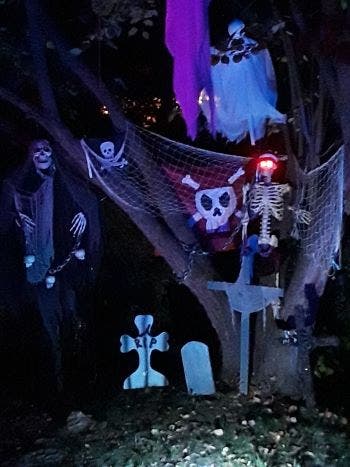 NEW! Skullnbone Cemetery, 14519 Club Circle Drive, Oak Forest – Ginger Jackson’s boneyard is currently up and running. This small, family friendly yard haunt features a cemetery, witches, ghosts, skeletons causing mischief, a 10-foot witch, spooky lighting and a newly expanded pirate area. Many props are handmade, DIY and/or repurposed items. The display has been expanded this year to include more items and details. Lights are on at 5 to 10 p.m. weekdays, 11 p.m. on weekends.