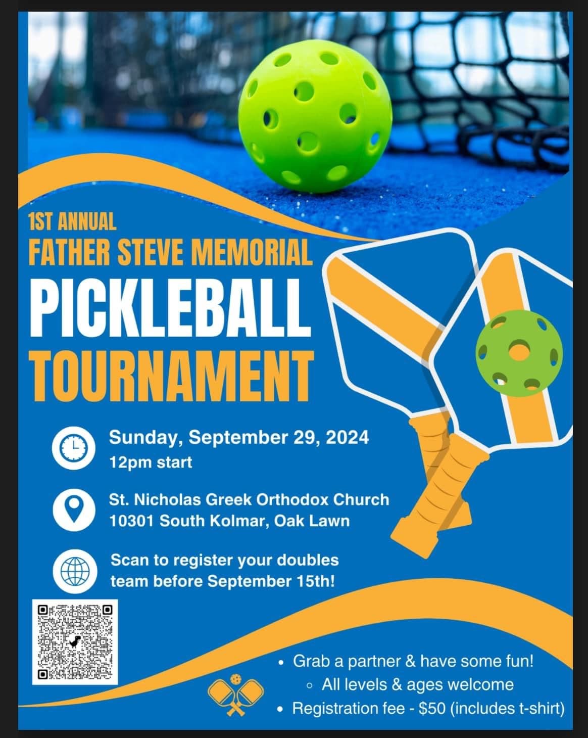 Community CornerPickleball Tournament 1st Annual Father Steve Memorial Pickleball Tournament St. Nicholas Greek Orthodox Church, Community ContributorPosted Sat, Aug 24, 2024 at 4:39 pm CT ShareJoin the conversation