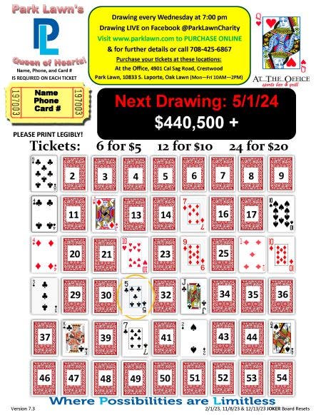 The current progressive raffle jackpot continues to set new records for Park Lawn, with 38 spots remaining, including two jokers that could reset the board. The person who finds the queen of hearts will split the jackpot 60-40 with Park Lawn if present, 50-50 if they’re playing in Facebook-land.