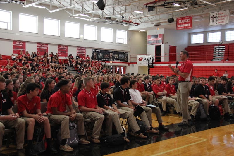 Principal Larry Tucker ’79, academic deans Joe Inzinga ’77 and Tom Gouterman, and admissions recruiter Pat Hogan ’05, along with a group of student ambassadors, greeted the students as they arrived to campus for freshman orientation on Aug. 22. The students assembled in the main gym where President Br. Hank Hammer, FMS, welcomed them, explaining that Marist is now their second home.
