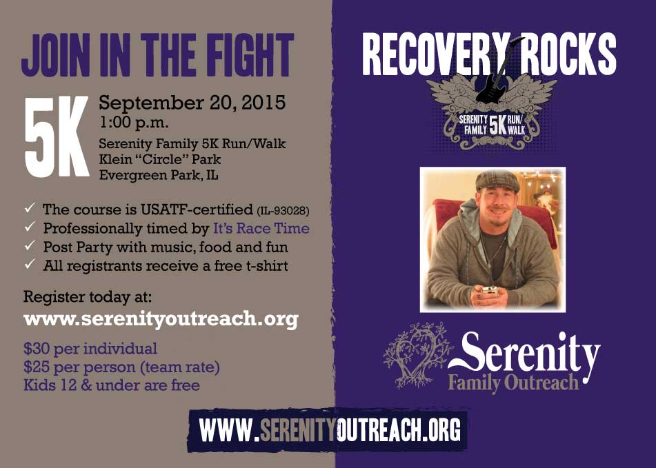 The day features Laser Sounds DJ, kids activities, and awards ceremony. Stay afterward for Serenity’s “Recovery Rocks” post-race party at Jacob’s Well Church, 3450 W. Maple Ave., Evergreen Park, featuring free pizza, live music with The Tilt, water and pop, a sweets table, face painting and balloon animals and live Bears game streaming (maybe the Cubs can be put on). The post-race party is FREE TO ALL.