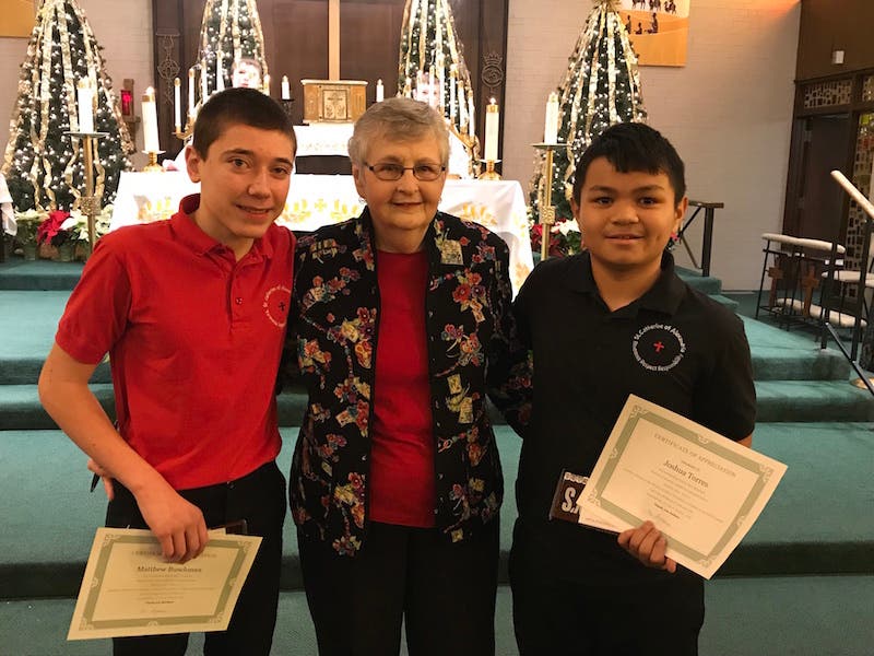 What happened next could have been a tragedy. Claire’s car proceeded to slid down the driveway, with her one leg outside the car. Claire knew she was in trouble, so she immediately screamed for help. Along came her first guardian angel, St. Catherine eighth-grader Matt Buschman. Matt put Claire’s car in park, and called sixth-grader Joshua Torres -- the second guardian angel -- to come and assist. The two young men proceeded to help Claire up and into her home. Had they not come along when they did, the incident could have been much more serious.