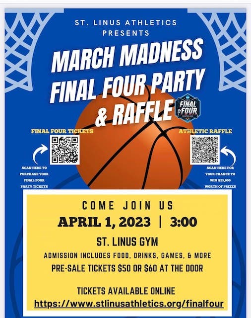 Watch the games at the St. Linus Athletics Club's March Madness Party this Saturday, April 1, with food and beverages, and a cash raffle.