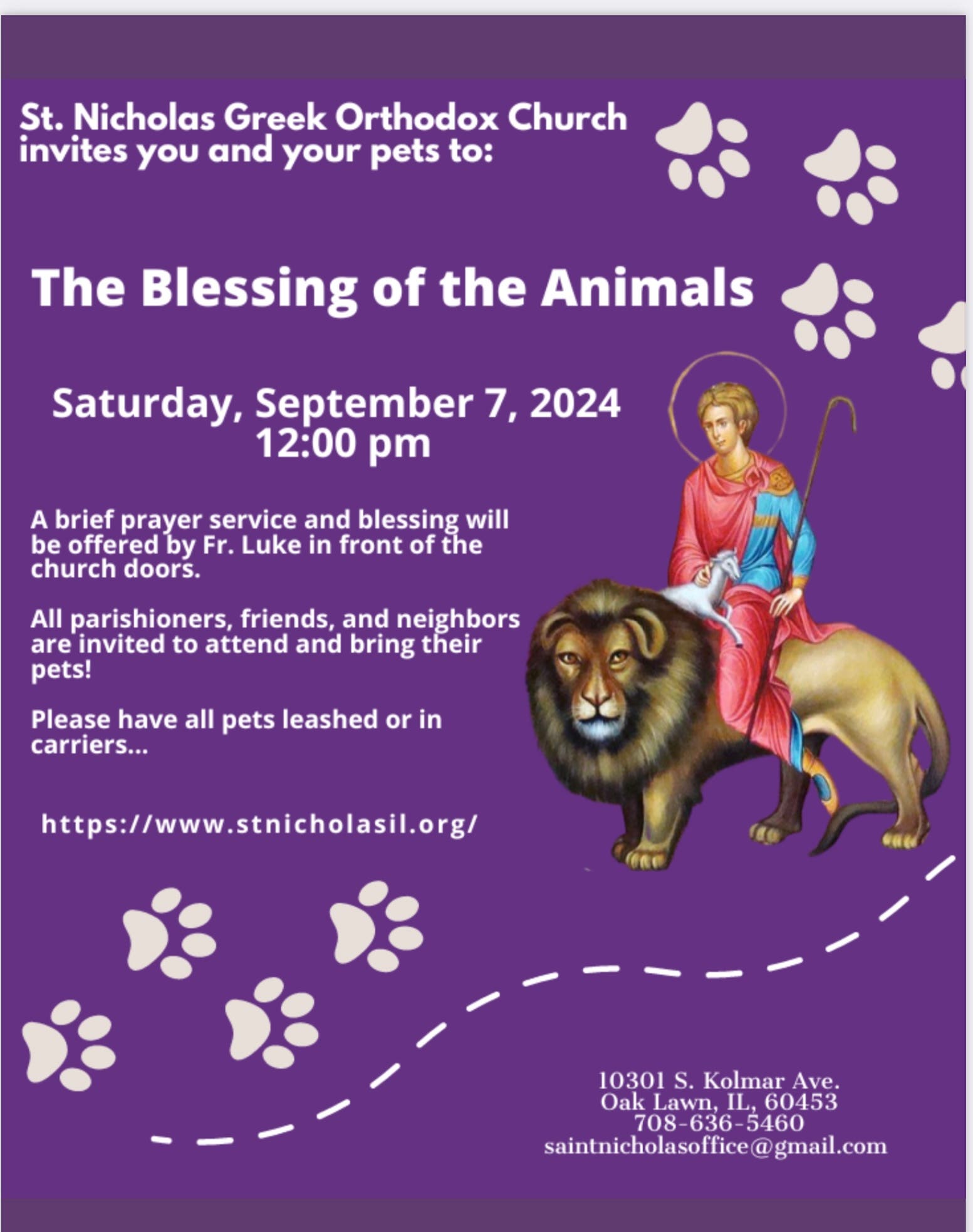 All our neighbors are invited to bring your pets to our annual Pet Blessing, Saturday, September 7 at noon at St. Nicholas Church, 10301 South Kolmar, Oak Lawn.