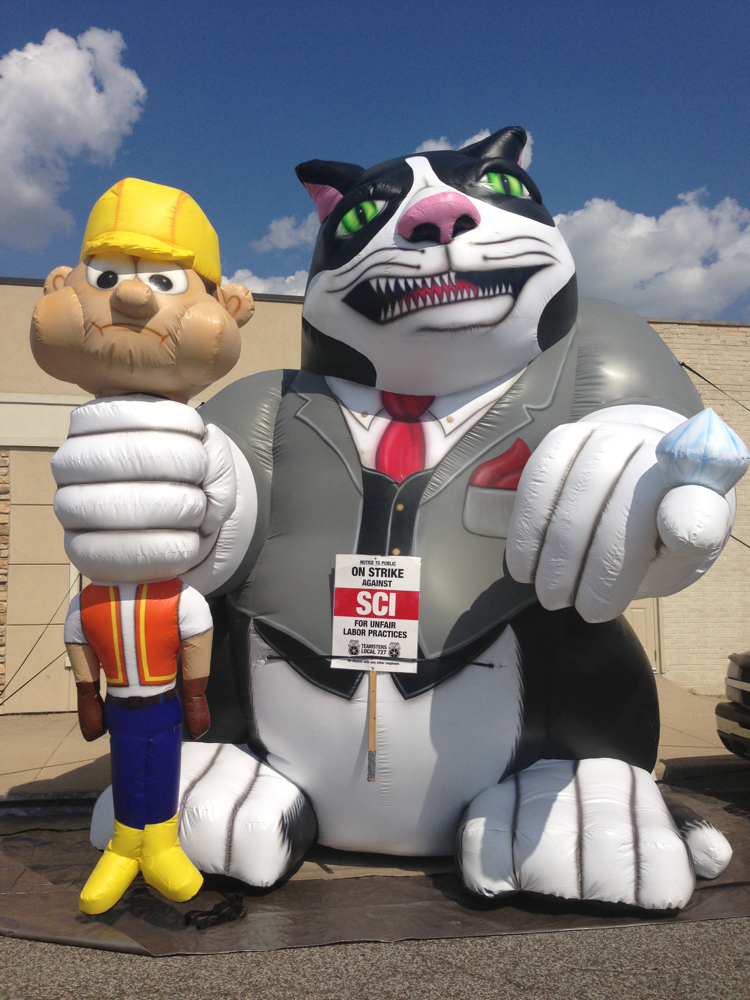 Striking funeral home employees from Teamster Local 727 inflated a giant fat cat squeezing the little man in front of an Oak Lawn funeral home on Tuesday.