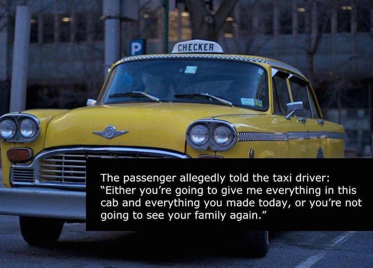 When the driver refused, the passenger allegedly told him he had two options: “Either you’re going to give me everything in this cab and everything you made today, or you’re not going to see your family again.”