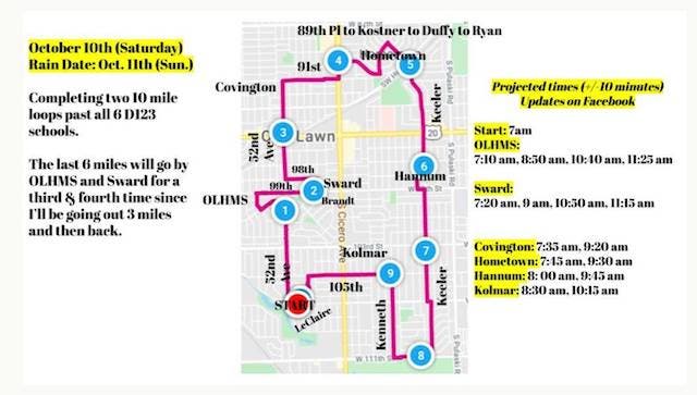 Ogean will make her way around each Dist. 123 school starting at 7 a.m. Saturday, Oct. 10, as she runs 26.2 miles in the virtual Chicago Marathon. She's hoping to raise $2,000 dollars for the Live Like Abby Foundation to help fight pediatric cancers.