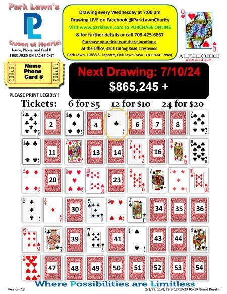 Park Lawn Queen of Hearts board for the July 10, 2024 drawing.