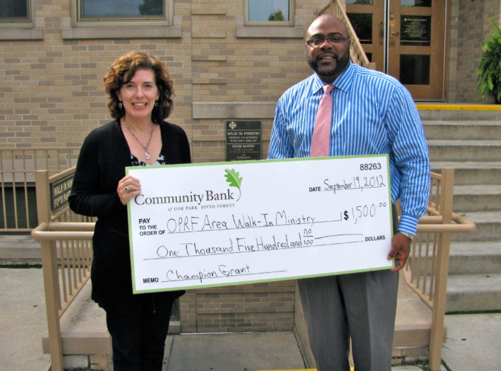 Community Bank of Oak Park River Forest is pleased to announce that the Oak Park River Forest Area Walk-In Ministry is the recipient of Community Bank’s Champion Grant. The purpose of the Champion Grant is to assist organizations in providing community outreach programs for low or moderate income individuals.