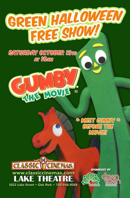 Oak Park, IL – This year, the Lake Theatre is adding the color green to the Halloween season as our favorite green claymation character Gumby makes his way to Oak Park! Kick off your Halloween festivities early this year at the Lake Theatre featuring a FREE screening of the 1995 film “Gumby: The Movie” (G) on Saturday, October 13th at 10 AM, presented using state of the art digital projection and sound technology. This special event is presented in conjunction with Downtown Oak Park’s Green Halloween event. Bring the whole family, and don’t forget your cameras, as Gumby will be making a very special appearance before the film! The Lake Theatre is located at 1022 Lake Street.