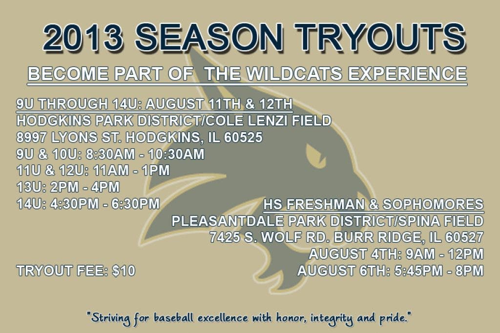 Become a part of the Wildcats Experience! The Wildcats are hosting open tryouts for all age levels, 9U thru 14U. Tryouts will be held at Cole Lenzi field in Hodgkins.