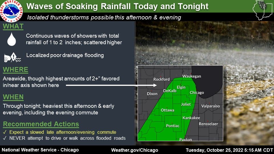ILLINOIS — Up to 2 inches of rain is expected Tuesday, and possibly more in some parts of the Chicago area, and the heavier rain is expected ahead of and during the evening commute, according to the National Weather Service.