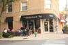 The renovations feature a long custom-made bench to accommodate patrons waiting for a table to become available. Rich wood paneling wraps the main room, which is packed with cherry wood chairs and shiny, copper-topped tables.