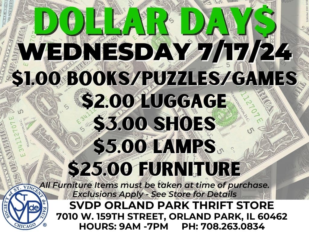 Orland Park, IL – The Society of St. Vincent de Paul Orland Park Thrift Store is excited to announce our much-anticipated Dollar Day Sale, happening on Wednesday, July 17th. Shoppers can enjoy incredible bargains for one day only!