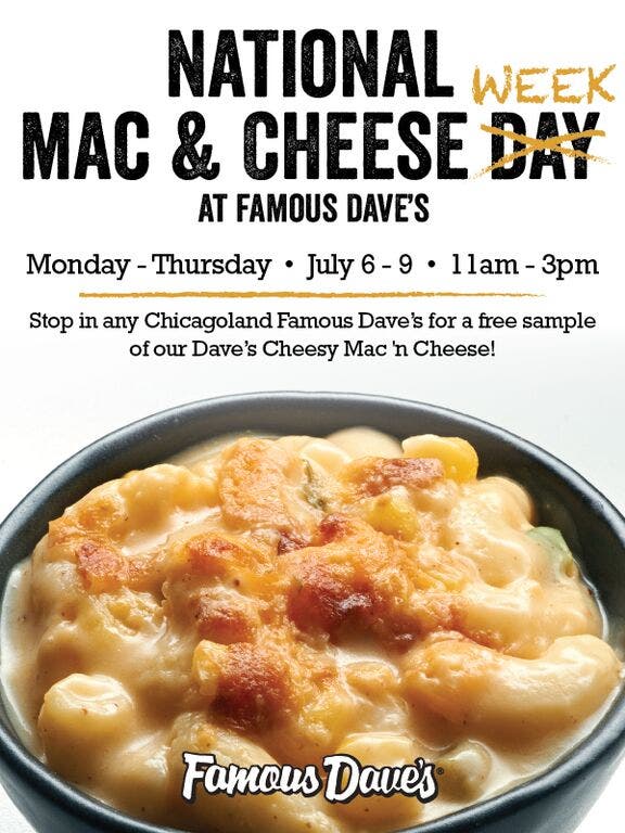 Mac ‘n Cheese Week July 6th – 9th National Macaroni Day has just been promoted to Macaroni week at Famous Dave’s. Guests can get a super sample size of their fan-favorite Dave’s Cheesy Mac ‘n Cheese during lunch 11am-3pm, July 6th – 9.