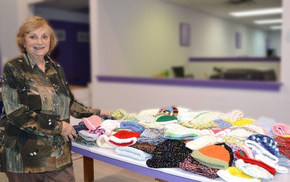 Indian Head Park Woman's Club 2nd Vice President and head recruiter Marge Nelson displaying some of the knitted hats, scarves and blankets.