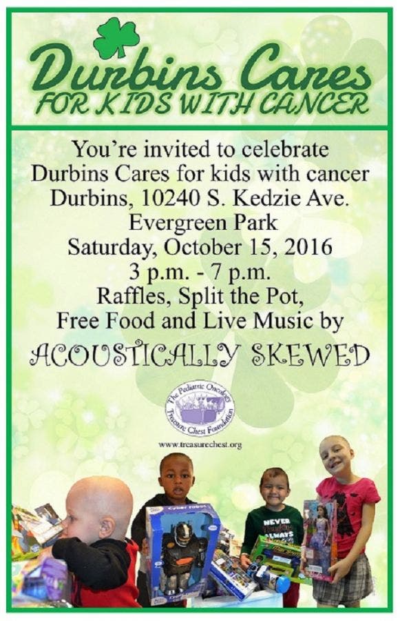 WHAT: Durbins in Evergreen Park is giving to children and teens fighting cancer. The bar is sponsoring its Sixth Annual Durbins Cares for Kids with Cancer Benefit on Saturday, October 15, 2016. All proceeds will benefit the Orland Park-based Pediatric Oncology Treasure Chest Foundation (POTCF), a non-profit organization that provides comfort and distraction from painful procedures to children and teens diagnosed with cancer by providing a toy, gift or gift card in 49 treatment centers nationwide.
