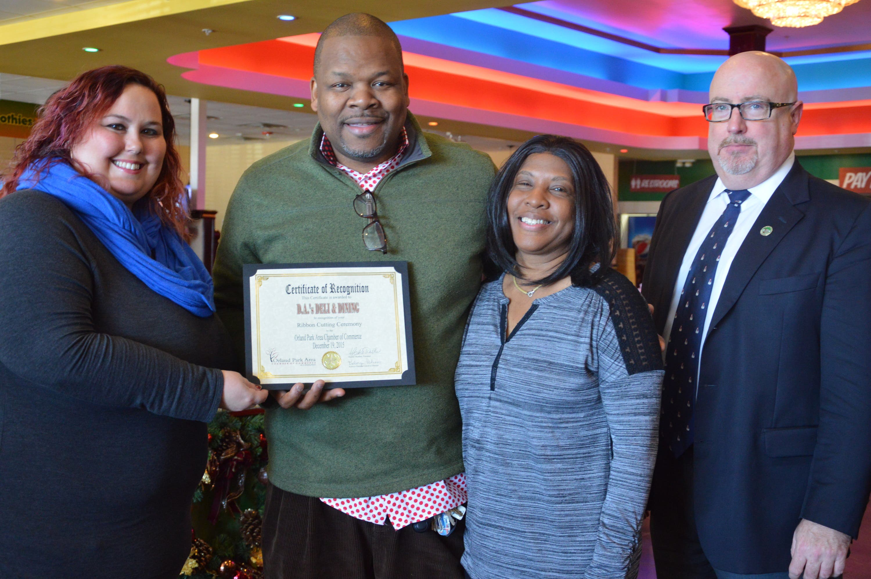 Orland Park Area Chamber of Commerce President Heather Warthen (left to right) is pictured with D.A.’s Deli & Dining owners Darryl Abernathy and Gloria Abernathy and Orland Park Village Trustee Michael Carroll during the restaurant’s Grand Opening Celebration held in December. Located at 7260 W 159th Street in Orland Park, D.A.’s Deli & Dining’s specialties include a one-pound corned beef sandwich and soul food favorites.