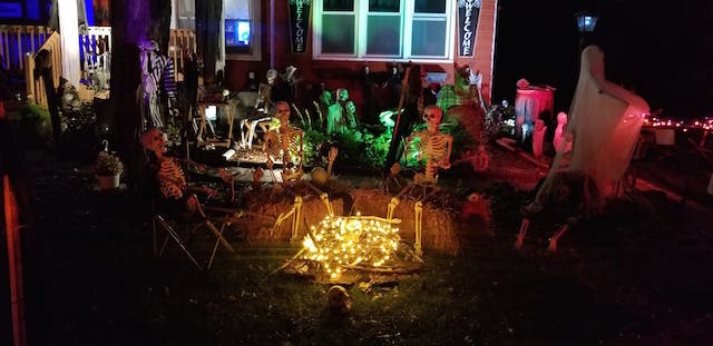 HAUNTED McHUGH MANOR, 18145 RIEGEL ROAD, HOMEWOOD -- It is all started 30 years ago when Karen McHugh and sisters would decorate their parents’ front lawn on Kedzie Avenue. Karen and husband Phil have resurrected the tradition by turning their front yard into a skeleton’s playlot. Each year we add to it, always to the delight of neighbors and passersby.