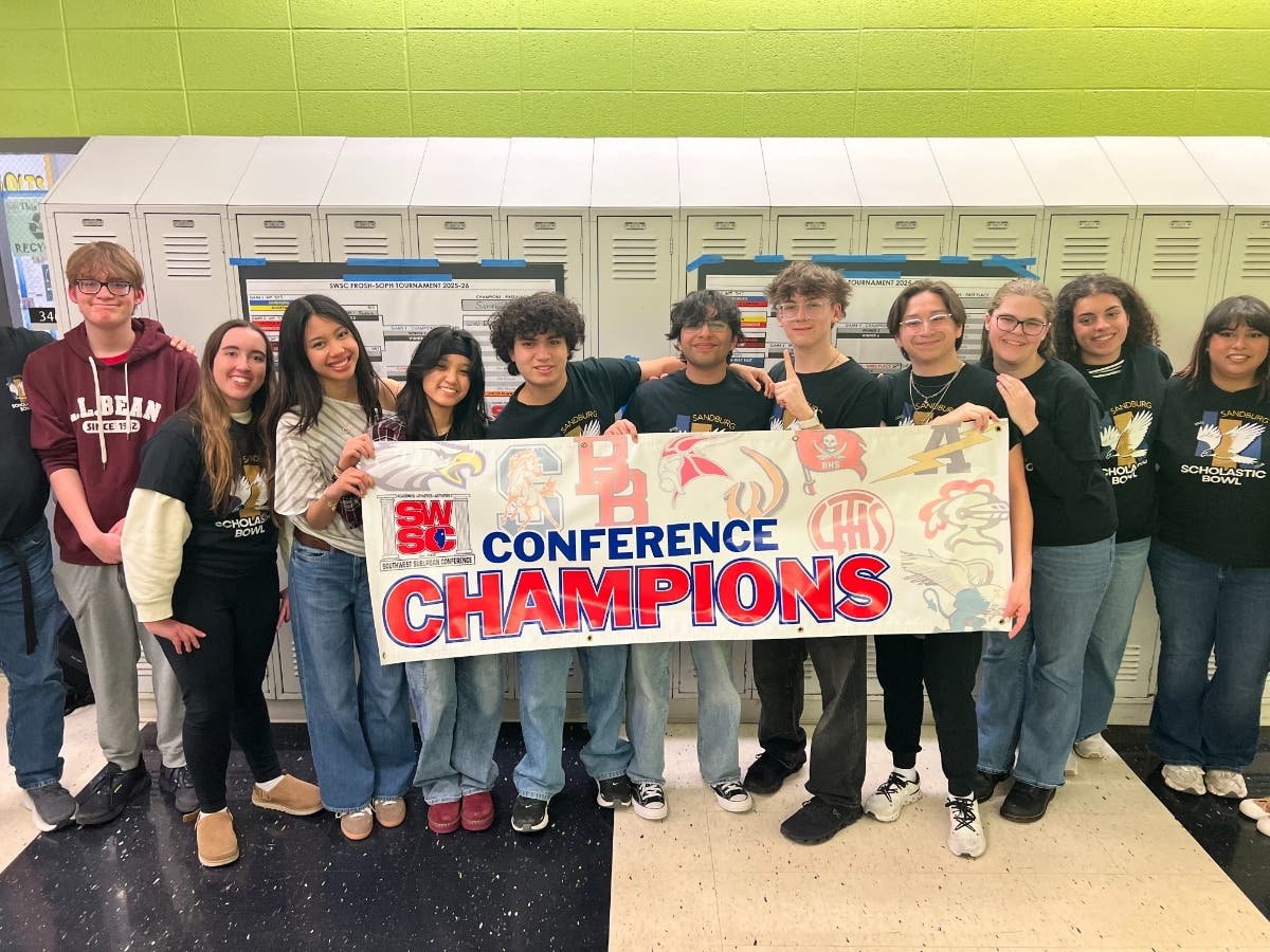 Carl Sandburg High School is celebrating an outstanding week of competition as its Scholastic Bowl teams captured first place in both the Varsity and Junior Varsity divisions at the final conference tournament, earning the title of Double Conference Champions.e Varsity team members include Jack Engel (11), Chloe McLaughlin (12), Yazhi Paguntalan (11), Giselle Tedera (11), Gianpiero Fazio (12), Ayaan Ghori (12), Adrian Kopec (11), Niko Diaz (12), Jamie Kenan (12), Leena Ahmad (12), and Kassie Morales (11).