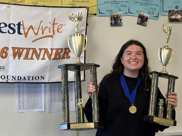 As the state winner, she also received a trophy, a writing journal, InvestWrite swag, and a $100 gift card. In addition, Simpson received a gift card to throw a pizza party for the class, and her parents received a plaque.