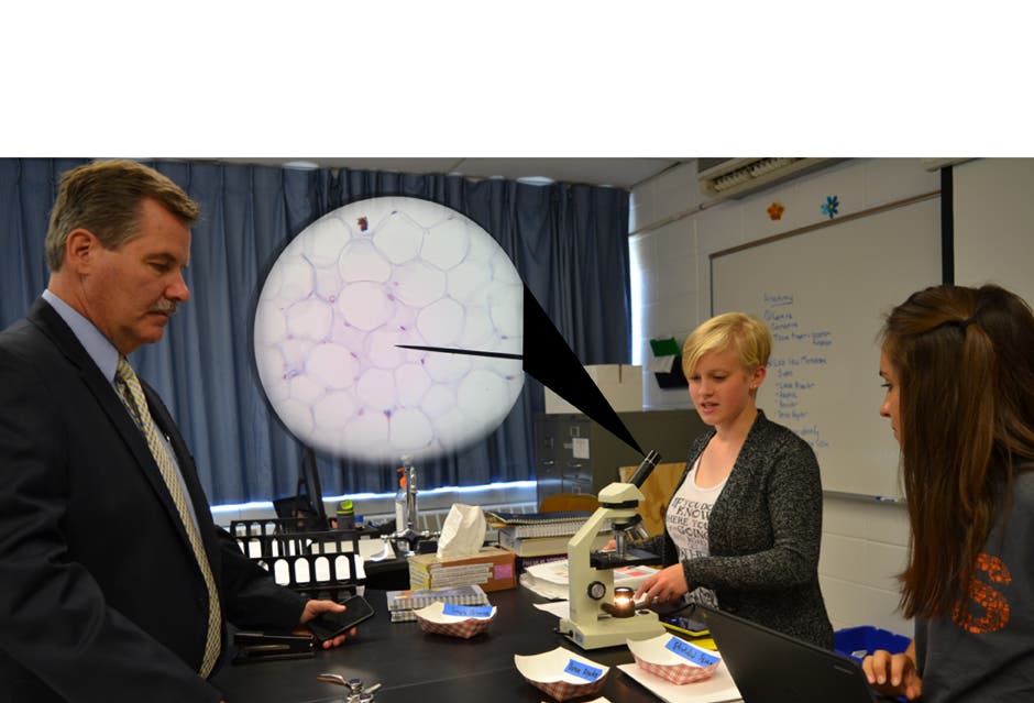Superintendent Dr. James M. Gay talks with Honors Anatomy and Physiology students as they view connective tissue through a microscope. INSET: Photograph of a cell taken by student Courtney Wehmeier. The students incorporate technology into the lesson by taking photographs of cell through the microscope using their mobile devices. They also record data using a Chromebook.