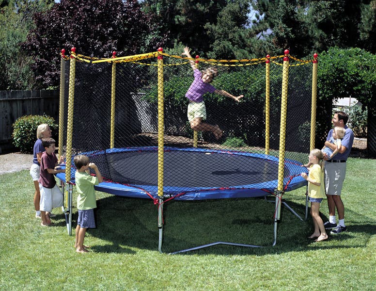 The trampoline is blue and yellow and has a black net around it, police said.