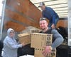 Pictured (l-r): Treasure Chest volunteers Kyle Kubasak, Marcin Sila and toy delivery driver Terico Maddox unload five pallets of the anonymous donation of toys at the Treasure Chest Foundation’s Orland Park warehouse. The toys will help bring smiles of joy to 13,300 childhood cancer patients nationwide.