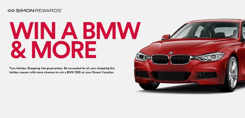 Simon Rewards Terms and Conditions and Sweepstakes Rules apply and can be found at SimonRewards.com. Car grand prize is a 3 year lease of a BMW 328i plus $5,000 cash for a total value of $22,500 and will be drawn on January 4, 2016. Vacation grand prize is $15,000 towards travel expenses plus $5,000 cash for a total value of $20,000 and will be drawn on December 28, 2015.