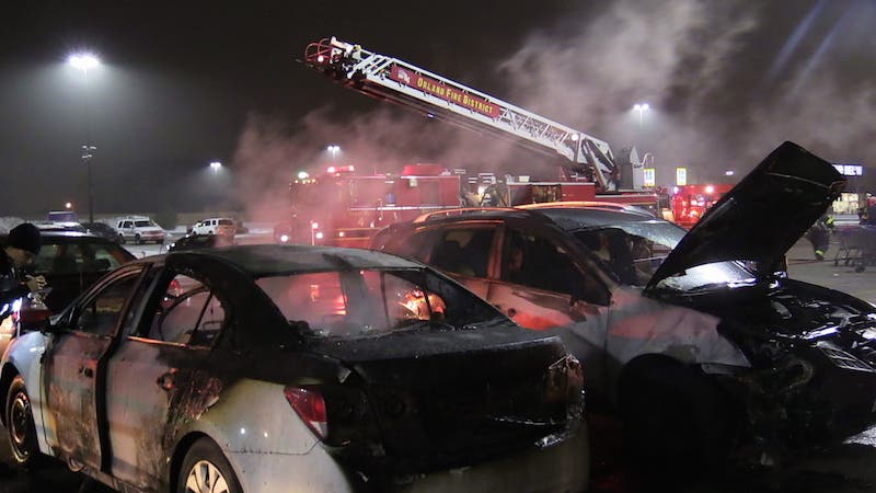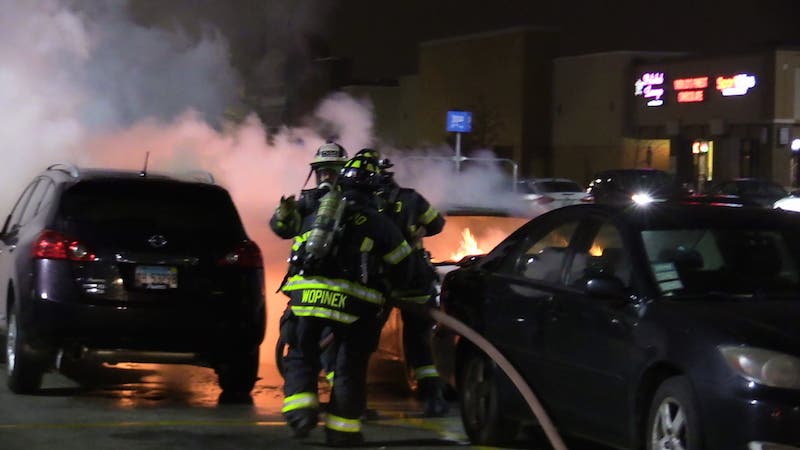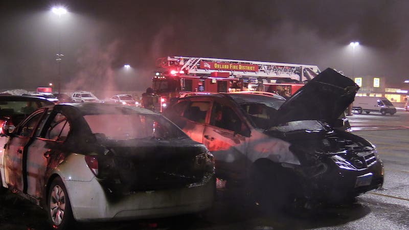 ORLAND PARK, IL -- Orland Park fire crews extinguished two cars that were on fire in the Walmart parking lot on Tuesday evening. Firefighters from the Orland Fire Protection District responded to a call of a fire around 7:20 p.m. in the Walmart Superstore parking lot at 9245 W. 159th St. in Orland Park.