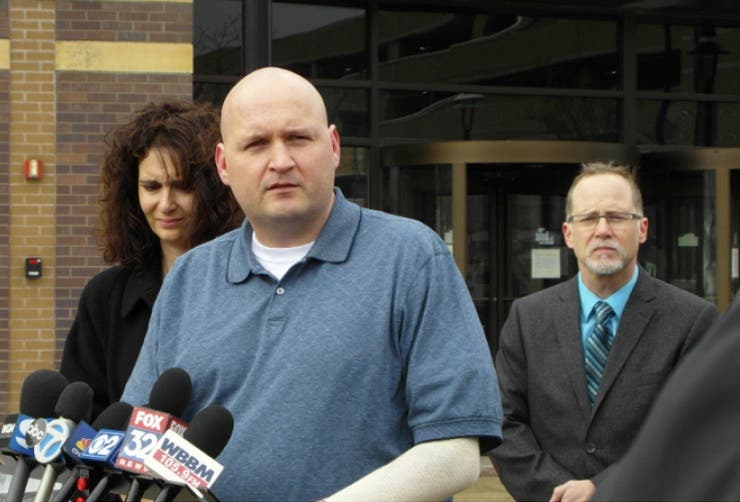 Caption: Illinois State Trooper Doug Balder, with wife Kimberli at his side, speaks at a press conference last month on the one-year anniversary of the fiery crash that nearly took his life and killed tollway worker Vincenzo Petrella. | Credit: Shannon Antinori