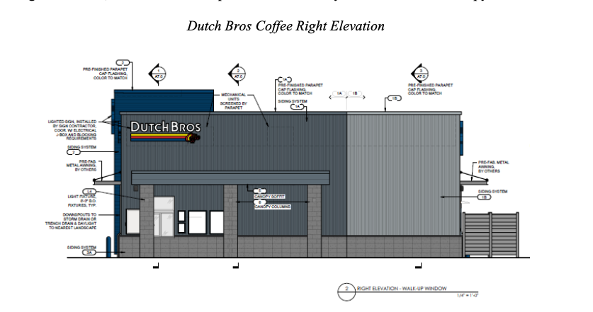 The proposed site plan includes two lots, the first of which — a one-acre parcel located farthest to the west — would be the first to develop, with a 989-square-foot, drive-thru-only Dutch Bros Coffee, with a sidewalk and a room for a walk-up window on the west side of the building and outdoor seating.