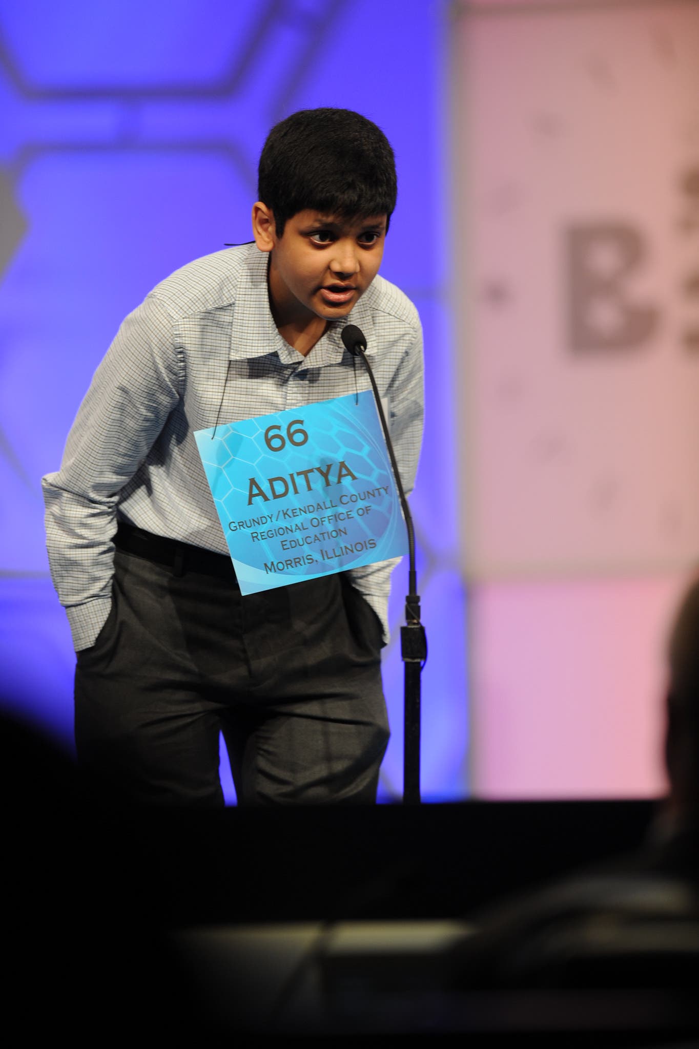 Photo credit: Mark Bowen/Scripps National Spelling Bee. Troy Middle School Seventh-Grader Aditya Nadkarni is seen here at the Scripps National Spelling Bee.