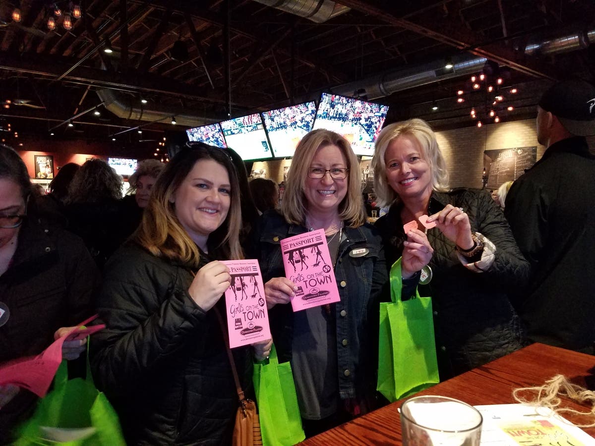 Attendees at the 2017 'Girls on the Town' event show off their swag bags and passports.