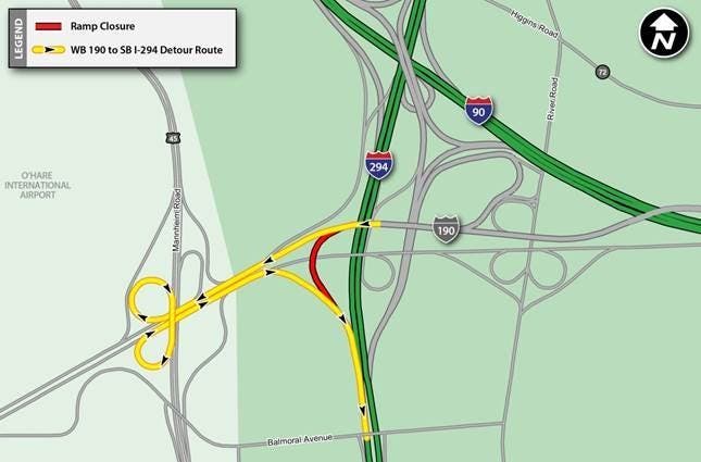 Overnight on Tuesday, April 16, the ramp connecting westbound I-190 to southbound I-294 is scheduled to close beginning at midnight and reopen by 5 a.m. on Wednesday, April 17, according to a news release from the Illinois State Tollway. A posted detour will direct traffic to exit at Mannheim Road, re-enter I-190 headed in the eastbound direction to reach southbound I-294.