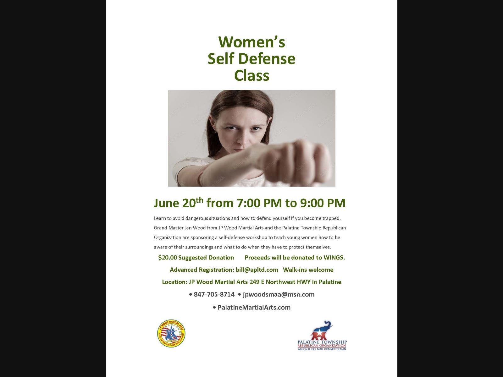 Jan Wood from JP Wood Martial Arts and the Palatine Township Republican Organization are holding a women’s self-defense class on Tuesday, June 20th from 7:00 PM until 9:00 PM at JP Wood Martial Arts at 249 East Northwest Highway in Palatine.