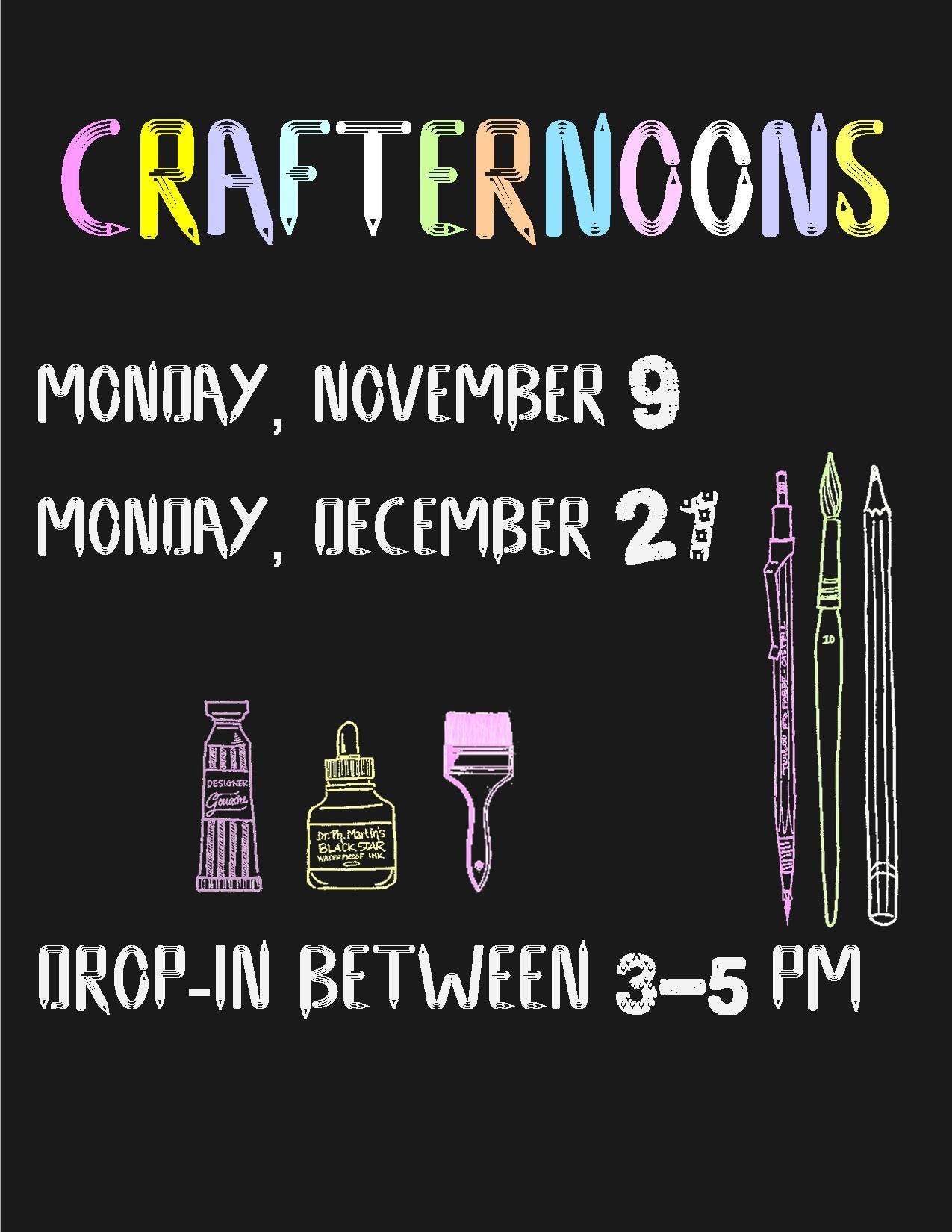 Get crafty with us! Swing by the Activity Room for an afternoon craft. All ages welcome. Monday, December 21 between 3pm and 5pm.