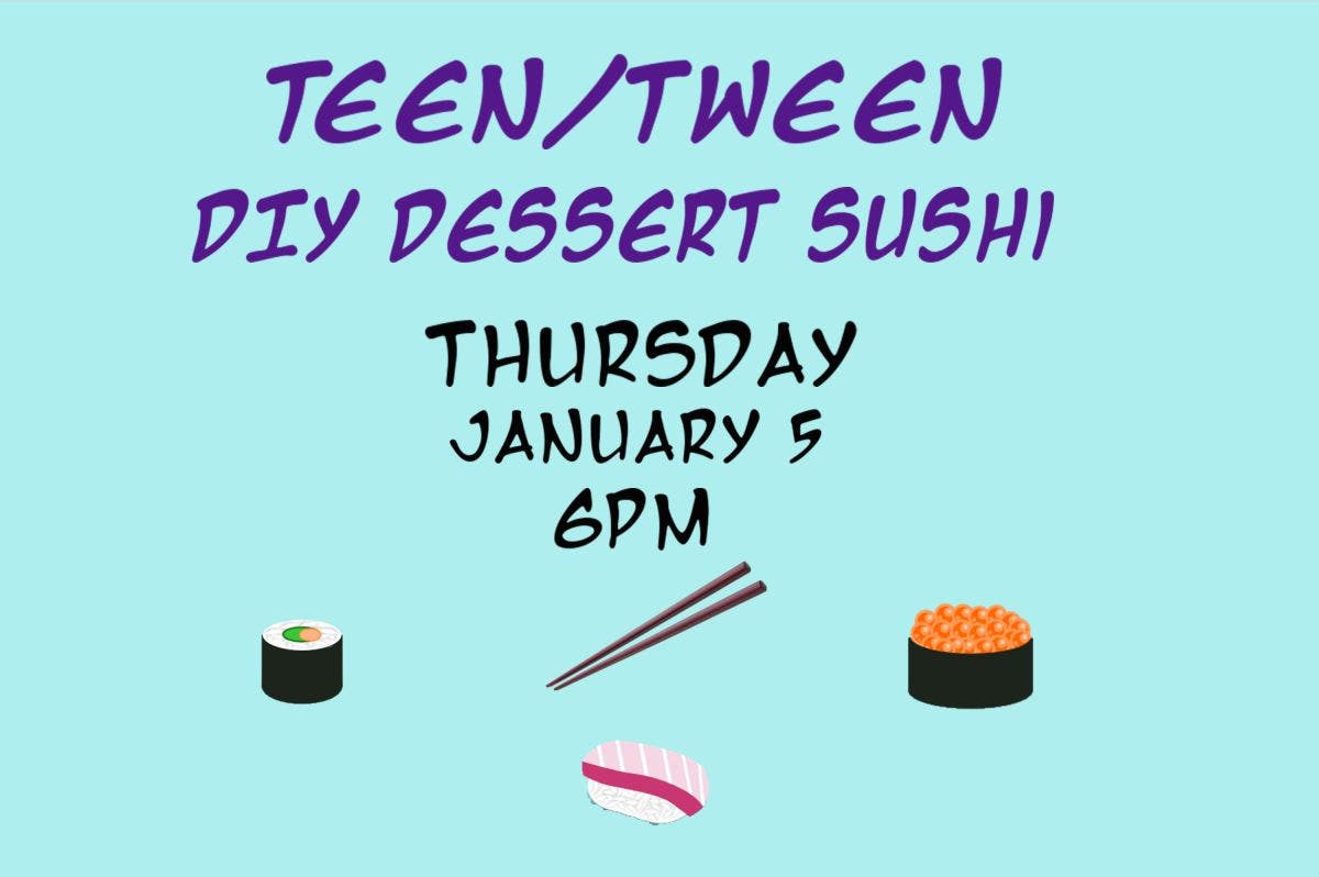 Come to the Library to make some sweet treats! We will be making candy sushi, fruit sushi, and Japanese smoothies. Registration is limited to 30. Ages 10–17. Thursday, January 5 at 6pm. Register online at greenhillslibrary.org.
